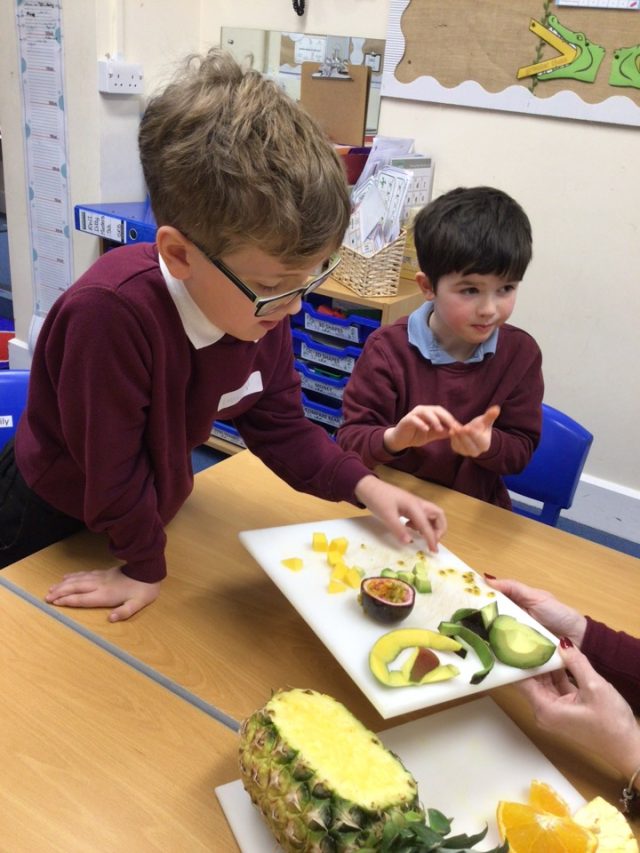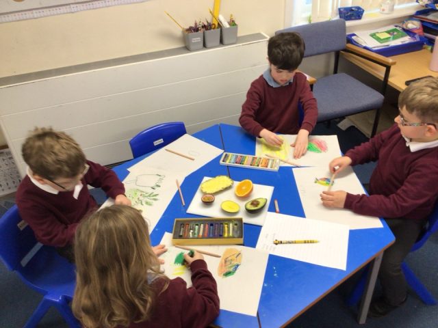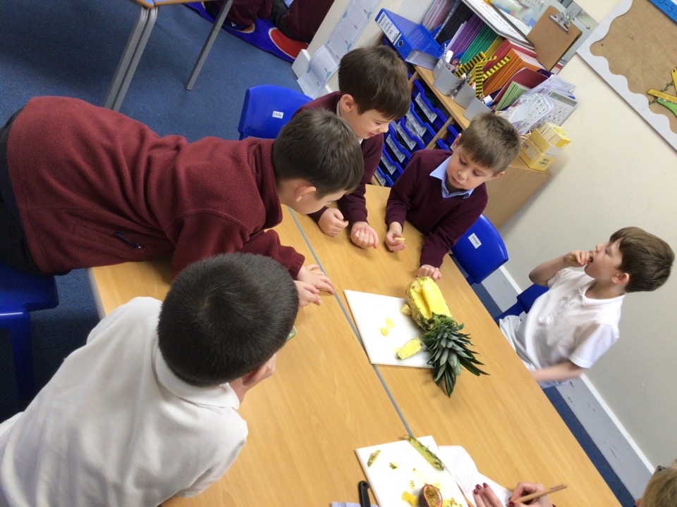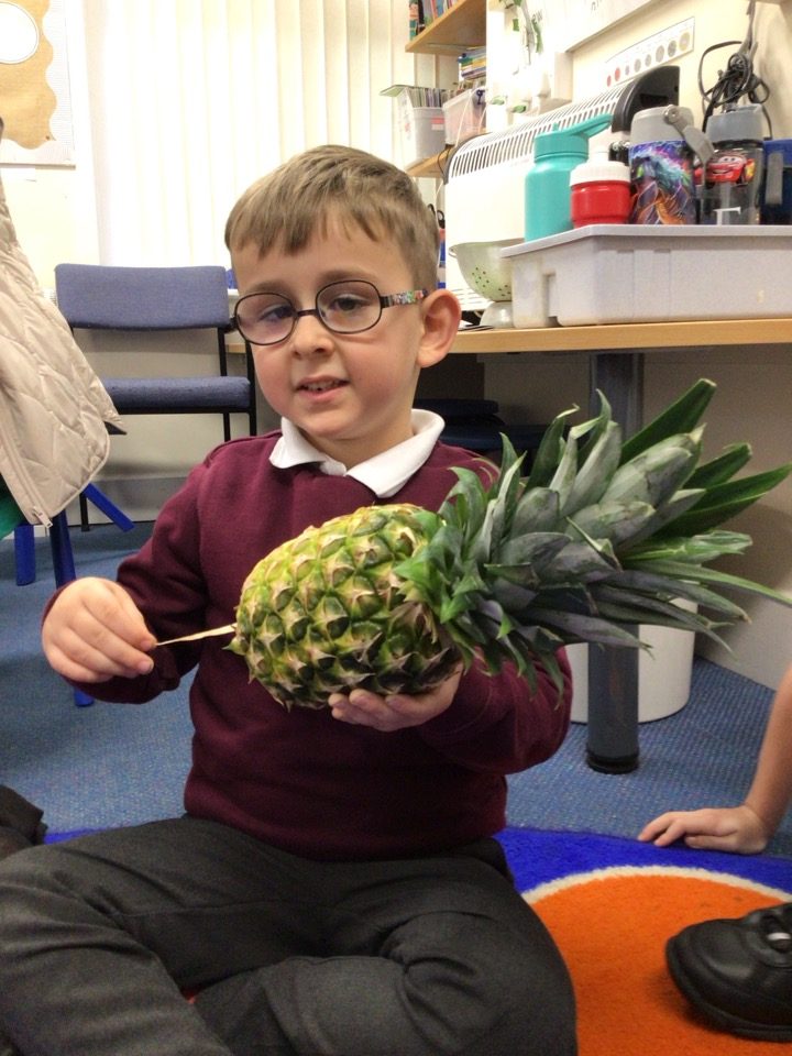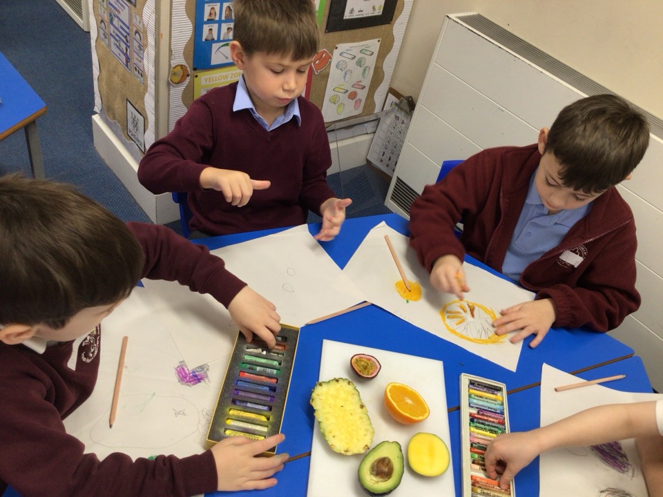 For talk for writing this half term, we have been listening to the story of Handa’s surprise. Our class received a letter asking for their help! Fruit went missing around our school and they needed our help to find them. We went on a journey around our school and managed to find them all – phew! We also had the opportunity to draw different pieces of fruit using pastels and studying what they look like on the inside and out. We had lots of fun tasting the different fruits and coming up with adjectives to describe them.