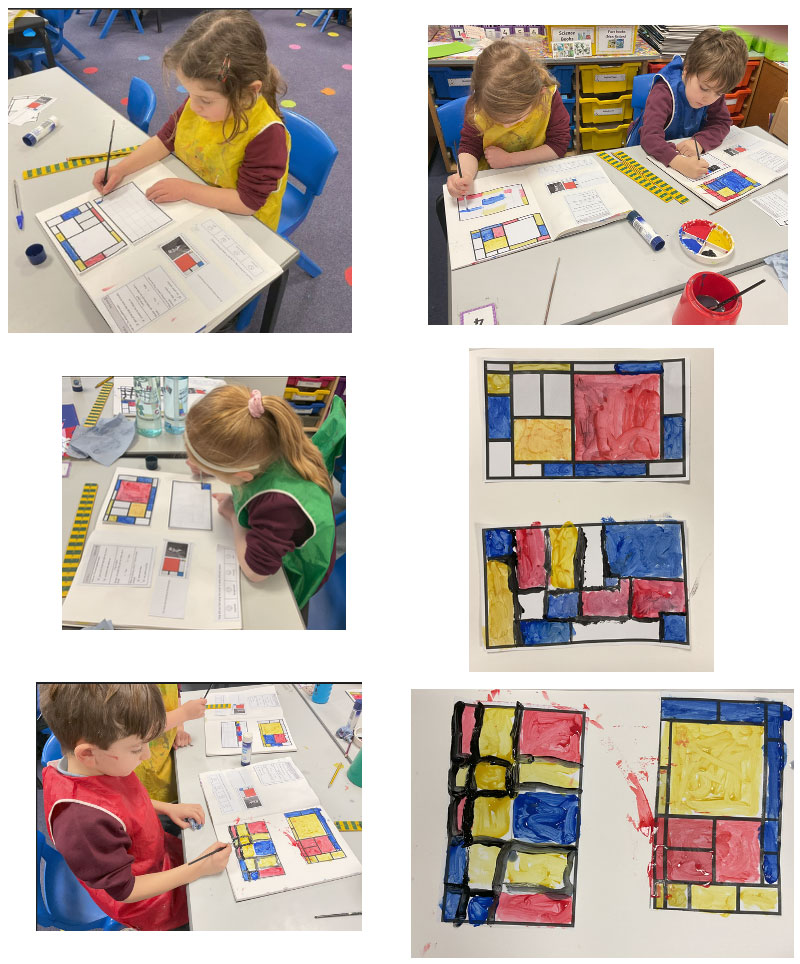 Year 1 made thick and thin paint marks on a range of surfaces. They used primary colours and the dip, dip, dab method of painting. After practising making controlled marks, they were ready to work in the style of Piet Mondrian. Initially, they painted in blocks of colours before creating their own shapes, painting within their shapes, and drawing black lines. Look how accurately and carefully they are holding their paintbrushes. Wonderful!