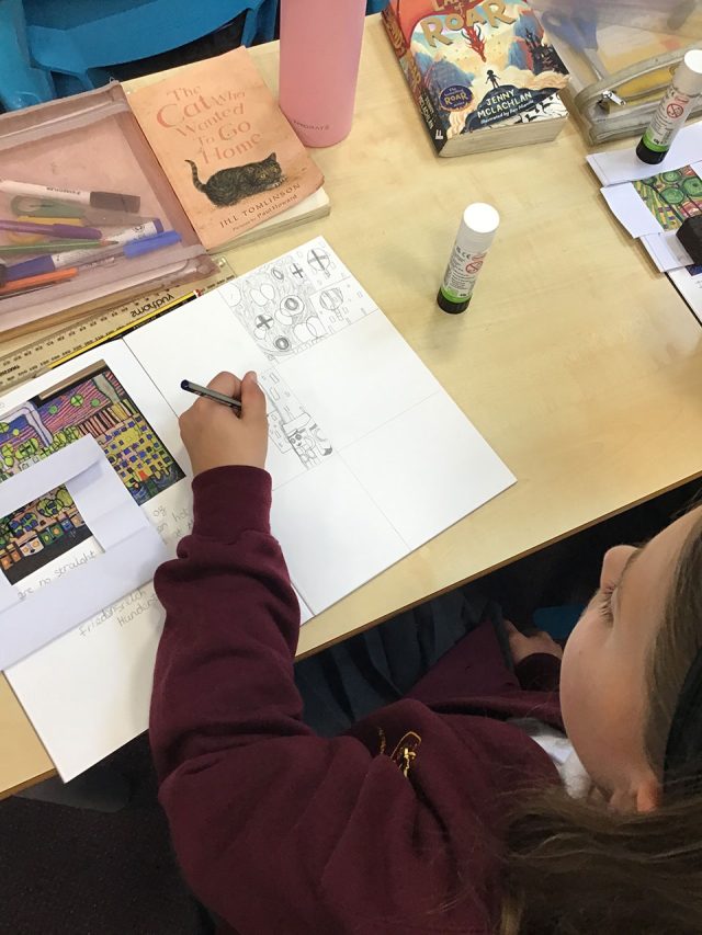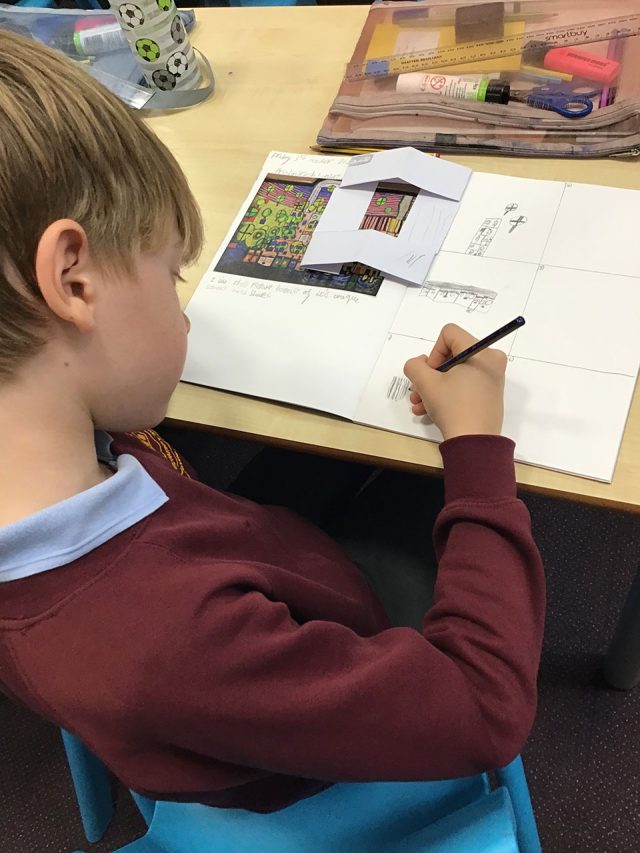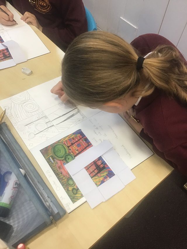 In art, we learnt about Friedensreich Hundertwasser. He was born in 1925. While he was alive he did some amazing drawings that we did. One thing we found is that he doesn’t like using a ruler! We copied the picture with the view finders we made ourselves. And today, we enlarged and painted our abstract Hundertwasser inspired pictures.